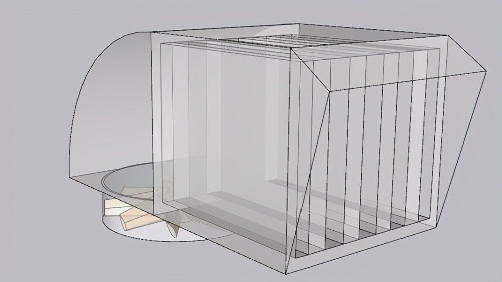 設(shè)置4個排風(fēng)口,在排風(fēng)口處增加強排風(fēng)措施,保證隔聲罩的換熱次數(shù),選用4臺12000 m3/h的風(fēng)機。排風(fēng)消聲器由0.5m排風(fēng)導(dǎo)流段+1.5m消聲段組成,截面為0.96平方米,設(shè)計排風(fēng)風(fēng)速7m/s。消聲段采用PY-10型片式消聲器,設(shè)計消聲量20dB。消聲器采用PY-10型片式消聲器,外殼由鍍鋅板+吸音材料(防火憎水布包裹)+吸音孔板(鍍鋅板才材質(zhì))組成,插片由吸音孔板(鍍鋅板才材質(zhì))+吸音材料(防火憎水布包裹)+吸音孔板(鍍鋅板才材質(zhì))組成防雨式設(shè)計,所有外表面烤漆處理。