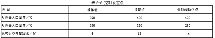 (2)氨儲存供應(yīng)系統(tǒng) 計量的氨氣可依溫度和壓力修正系數(shù)進行修正。從煙氣側(cè)所獲得的no,信號饋入有計算所需氨氣流量的功能??刂破骼冒睔饬髁靠刂扑璋睔?,使摩爾比維持固定。氦氣供應(yīng)管線上有一個緊急關(guān)斷裝置,當入口煙氣溫度過低、過高或氨空氣稀釋比過高時,均與該裝置連鎖,迅速關(guān)斷,以確保操作安全和防止催化劑損壞。最初設(shè)定點見表8-8。