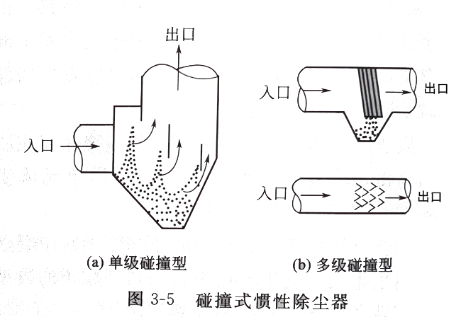 利用粉塵與氣體在運動中的慣性力不同,使粉塵從氣流中分離出來。在實際應用中實現(xiàn)慣性分離的一般方法是使含塵氣流沖擊在擋板上,使氣流方向發(fā)生急劇改變,氣流中的塵粒慣性較大,不能隨氣流急劇轉(zhuǎn)彎,便從氣流中分離出來。在慣性除塵方法中,除利用了粒子在運動中的慣性較大外,還利用了粒子的重力和離心力。
