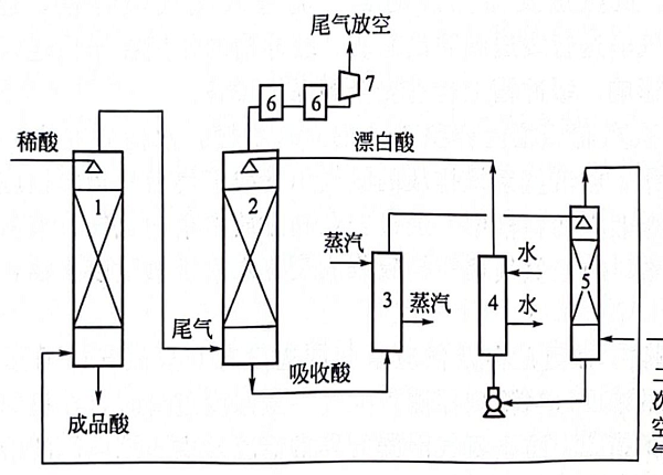 1-硝酸吸收塔;2-尾氣吸收塔;3一加熱器;4一冷卻器;5-漂白塔;6-尾氣預(yù)熱器;7-尾氣透平